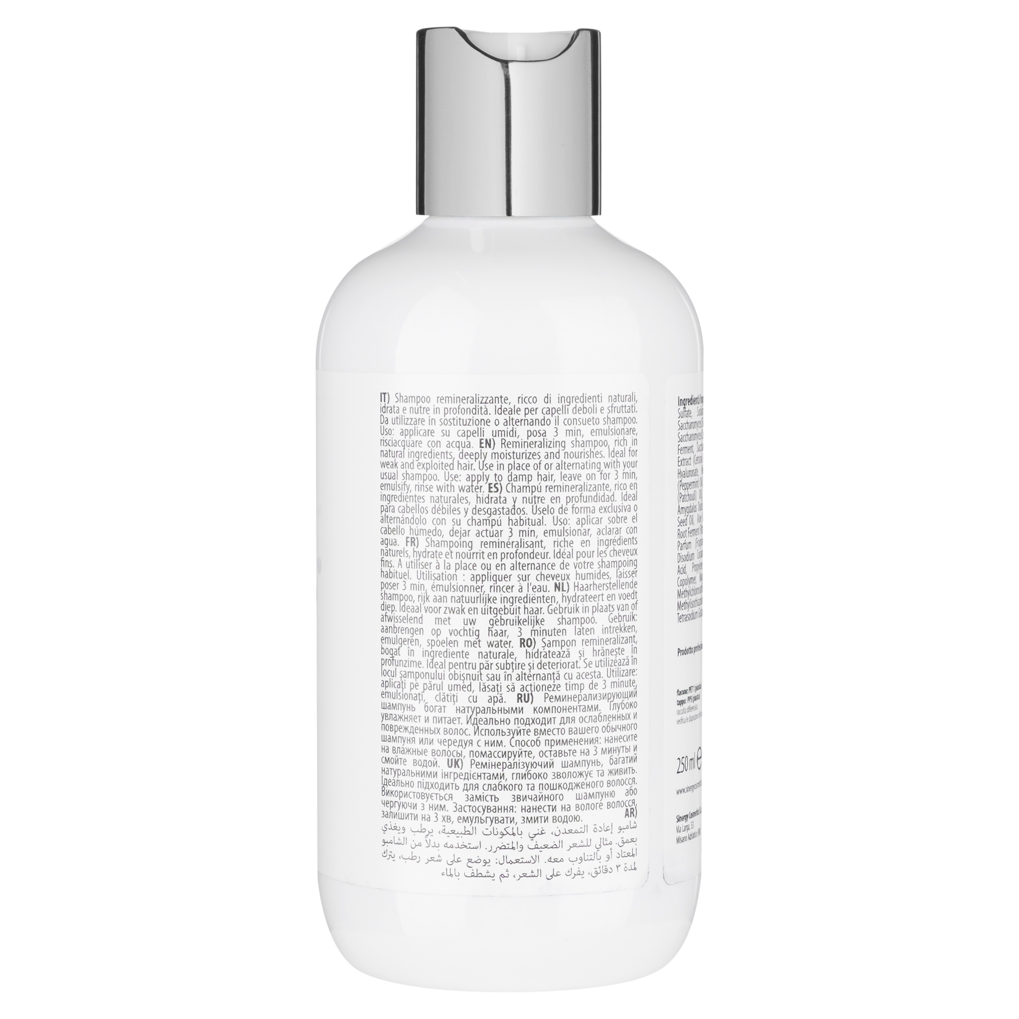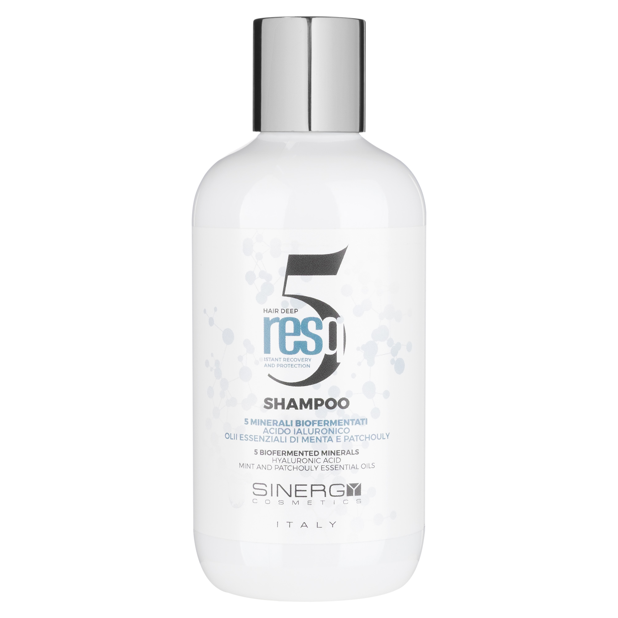 Ремінералізуючий шампунь RESQ5 Sinergy, багатий натуральними компонентами ( гіалуронова кислота, магрій, цинк, залізо, мідь), глибоко зволожує та живить. Ідеально підходить для слабкого та пошкодженого волосся.